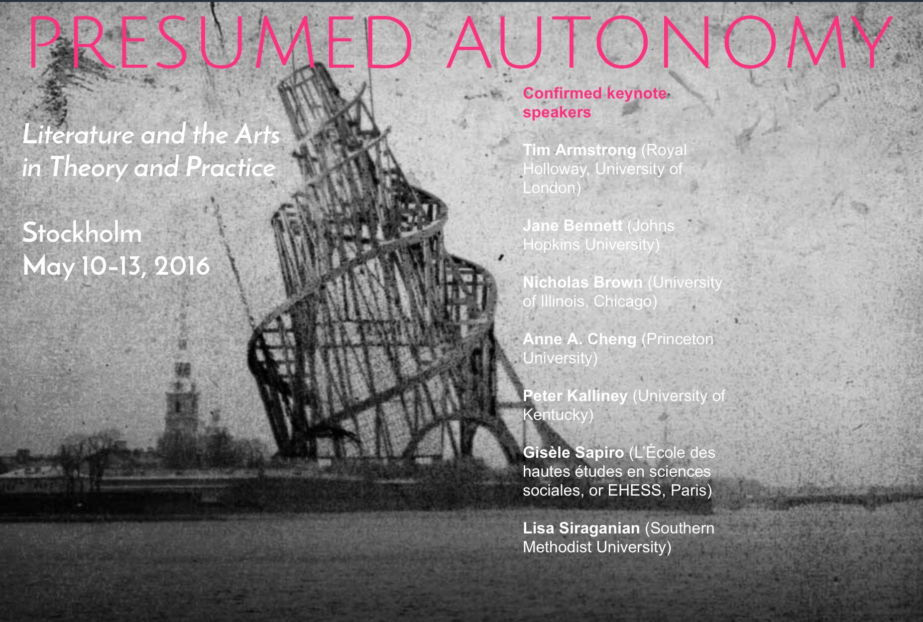 So come to this conference and hear keynote addresses by me… and Tim Armstrong (Royal Holloway, University of London), Jane Bennett (Johns Hopkins University), Nicholas Brown (University of Illinois, Chicago), Anne A. Cheng (Princeton University), Peter Kalliney (University of Kentucky), Gisèle Sapiro (L’École des hautes études en sciences sociales, or EHESS, Paris). http://presumedautonomy.se